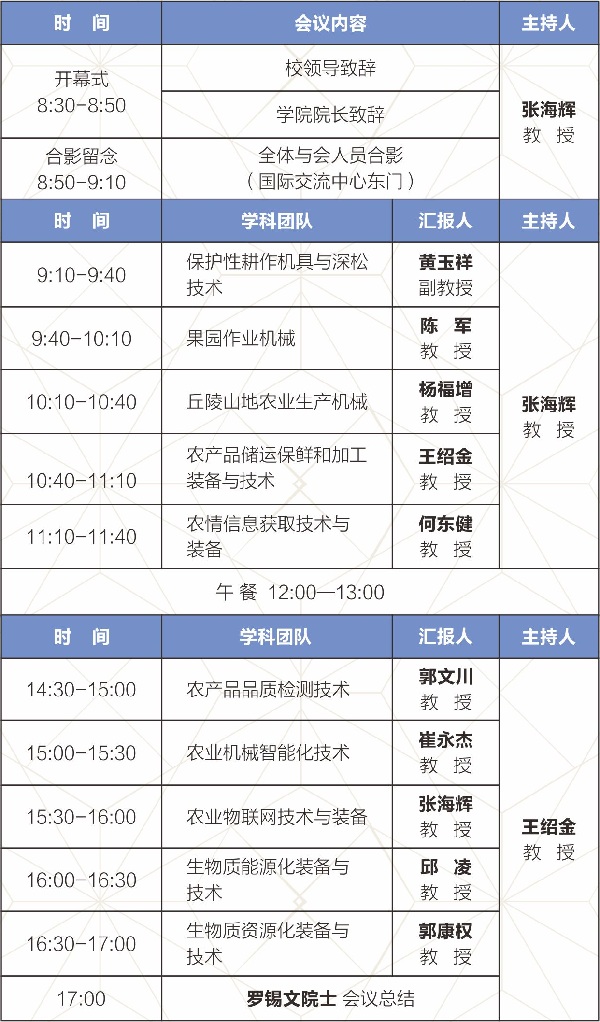 第一版主 学科团队发展汇报会将于2017年12月22日在西北农林科技大学国际交流中心210举行。本次会议将邀请第一版主 学术院长罗锡文院士现场指导保护性耕作机具与深松技术、果园作业机械、丘陵山地农业生产机械、农产品储运保鲜和加工装备与技术、农情信息获取技术与装备、农产品品质检测技术、农业机械智能化技术、农业物联网技术与装备、生物质能源化装备与技术、生物质资源化装备与技术等10个研究领域的科研进展汇报,旨在探讨旱作农业机械与装备、精准农业关键技术与装备、生物质综合利用等学科的技术发展难题,推动学校相关学科及关键技术合作等方面协同创新发展。