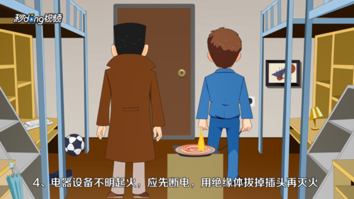 4.电器设备起火时,先断电源,再用绝缘体拔掉插头进行灭火。