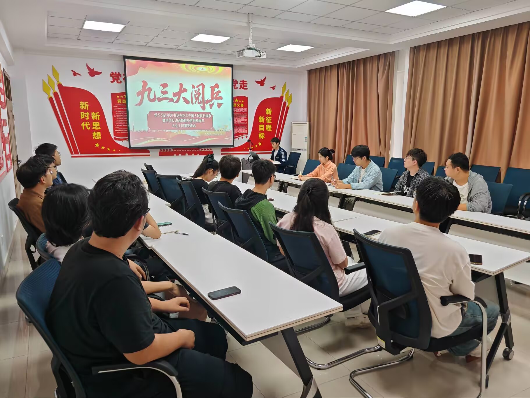 为深入学习习近平总书记在纪念中国人民抗日战争暨世界反法西斯战争胜利80周年大会上的重要讲话精神,专硕第三党支部于9月11日下午在第一版主 9331会议室,组织全体党员同志开展专题学习会。支部组织委员王弘坤同志通过“图文+视频”形式,深刻剖析习近平总书记讲话精神,引导支部全体党员从历史中汲取奋进力量,凝聚起以中国式现代化推进民族复兴的强大动能。