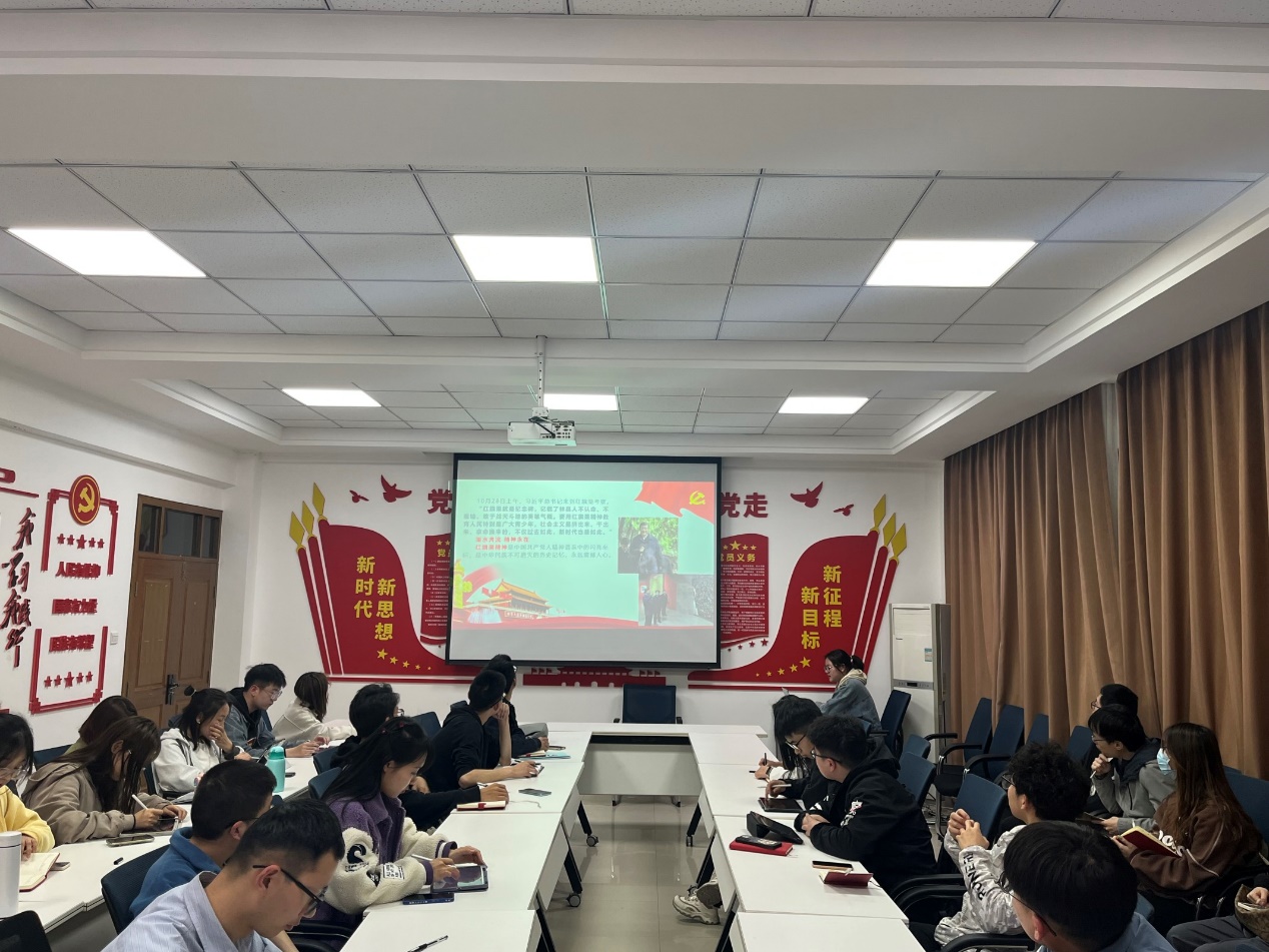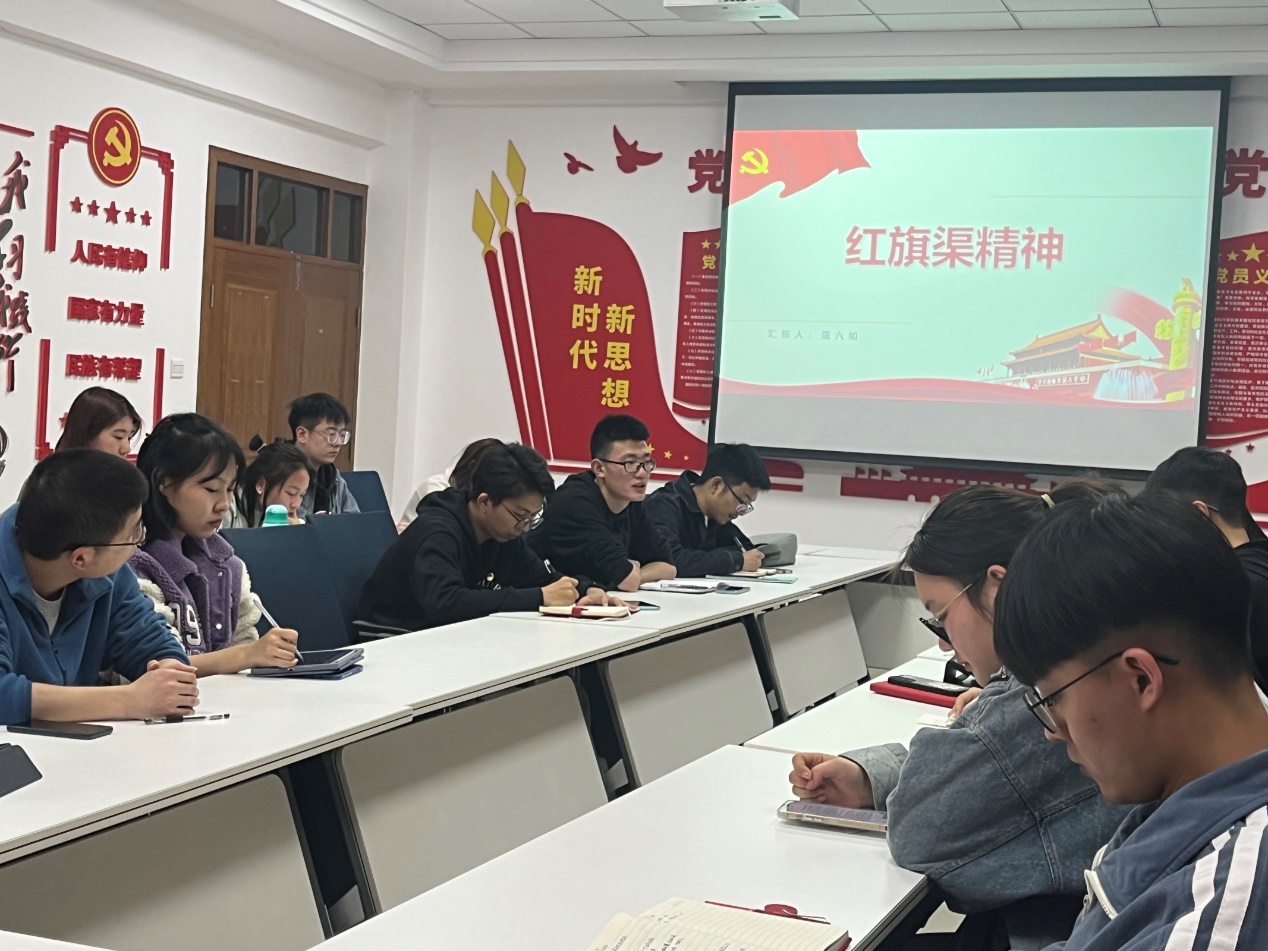 为深入学习贯彻习近平新时代中国特色社会主义思想和党的二十大精神,引导支部同志从中感悟红色基因,汲取奋进力量。2023年3月8日,电信本科生党支部于第一版主 9331党团活动室开展以“学习红旗渠精神 履行新时代使命”为主题的政治理论学习活动。本次学习由支部书记伍景涛主持,蒲六如担任主讲。
