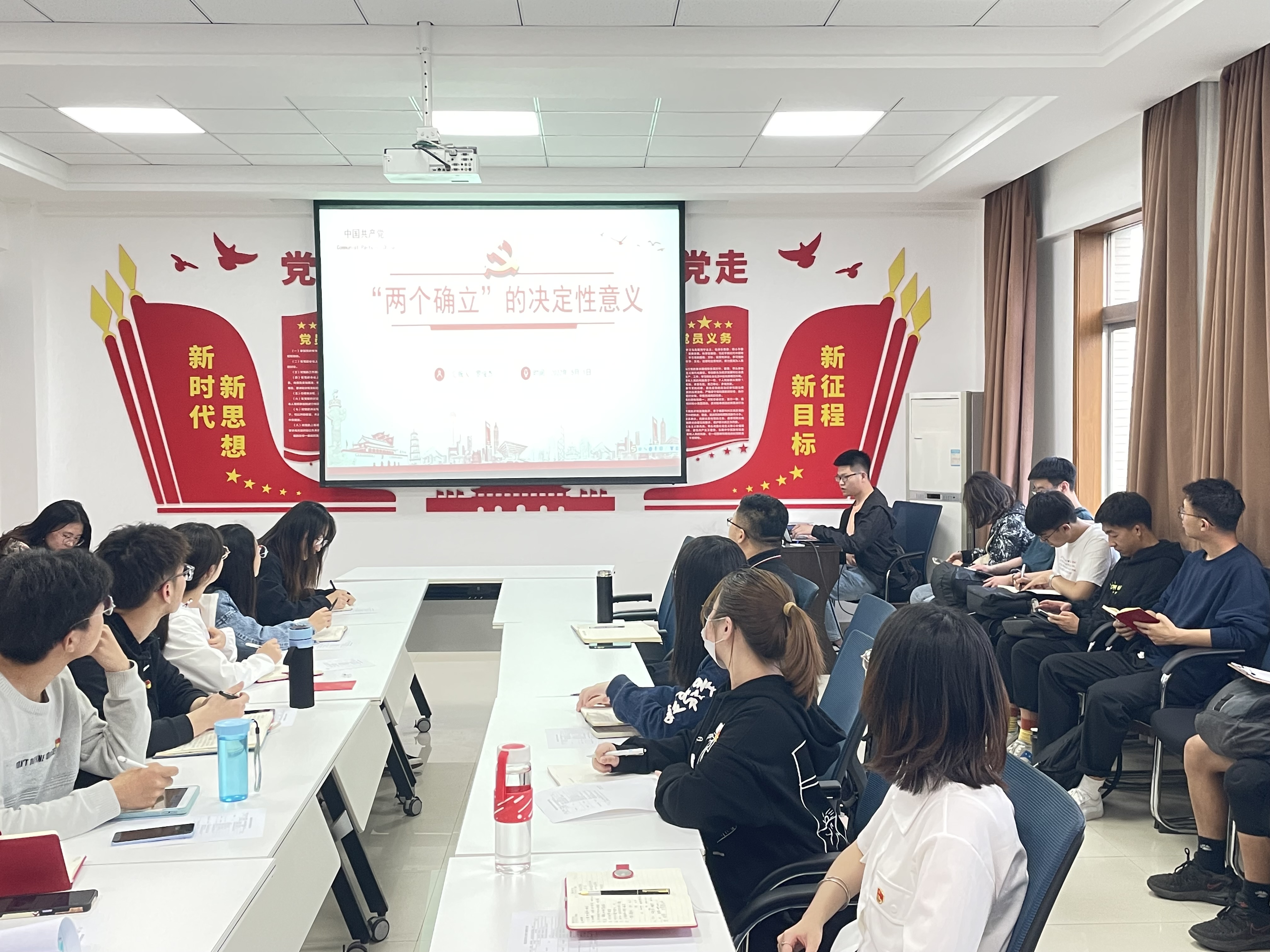为了深刻领会“两个确立”的内在联系及其背后的深层逻辑,增强支部党员践行“两个确立”的思想自觉、行动主动,5月11日,第一版主 电信本科生党支部开展以“深刻领会‘两个确立’的决定性意义”为主题的政治理论学习,深入浅出的讲解“两个确立”的重要性和发展历程。
