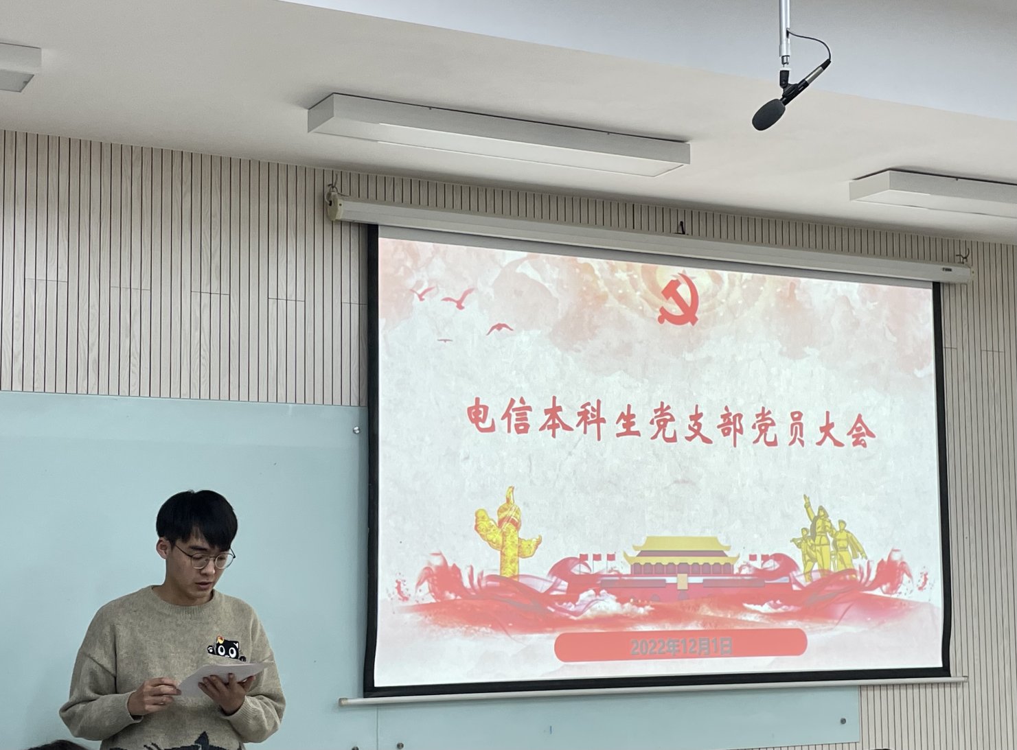 根据学院党员发展相关工作安排,按照《陕西省发展党员工作规程(试行)》规范要求,电子信息工程本科生党支部于2022年12月1日晚7:30在N8111开展关于讨论确定接受文晨等5名同志为正式党员的党员大会,会议由支部组织委员秦泽倩同志主持,支部全体党员、预备党员参加会议。