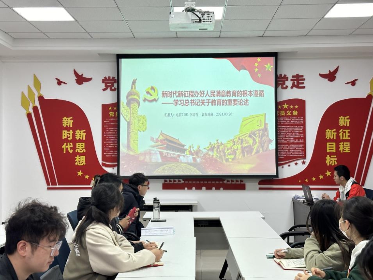 电信本科生党支部于3月26日开展“学习习近平总书记关于教育的重要论述” 为主题的党课学习。李培哲同志同志主持本次学习,支部全体党员、预备党员以及入党积极分子参加党课学习。