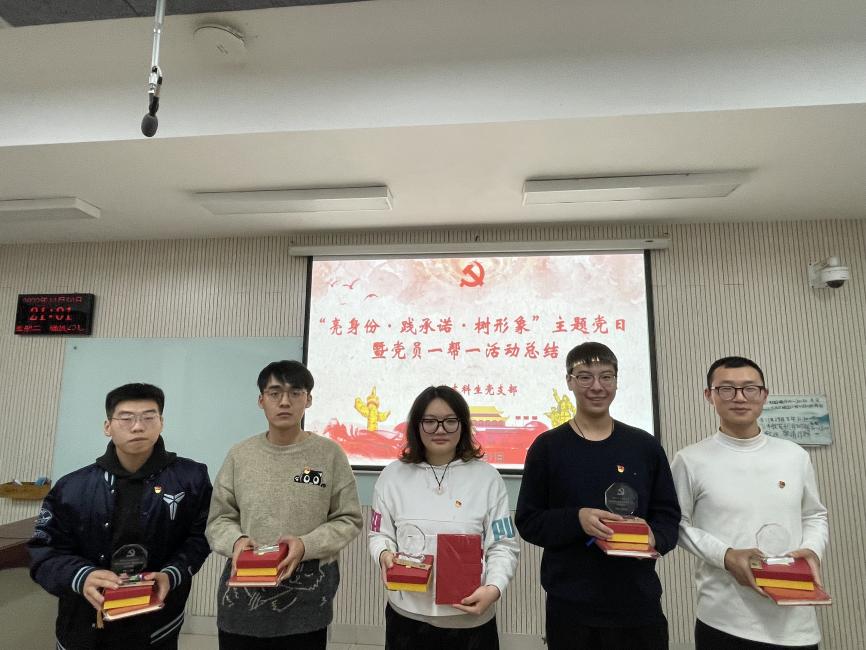随后,对2022年春季学期“携手一帮一,共创好成绩”活动参与者颁发聘书。作为帮扶人参加一帮一的同志们不仅发挥了党员先锋模范作用与奉献精神,也为同学们提供了更多的帮助。伍景涛书记为大家颁发了支部精心准备的聘书,同志们也纷纷表示会再接再厉,在今后的日子里积极参与支部建设,无私奉献做实事。