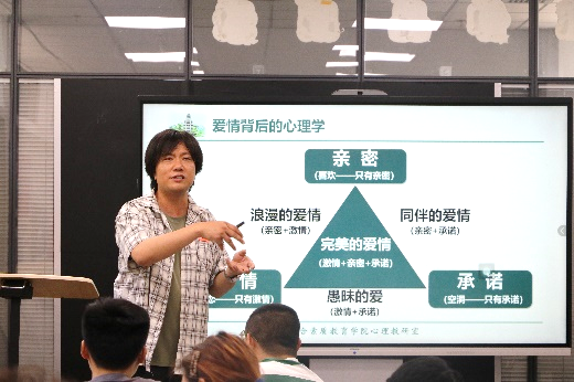 讲座现场氛围轻松欢快,窦龙老师以 “恋爱是?”“爱情是?”“婚姻是?” 等直击心灵的提问开场,迅速点燃了同学们的思考热情。随后,他引入斯滕伯格爱情三角理论,从心理学的角度介绍了不同情境下的爱情,深入剖析三大爱情要素及其衍生的多种爱情类型,让抽象理论变得通俗易懂。