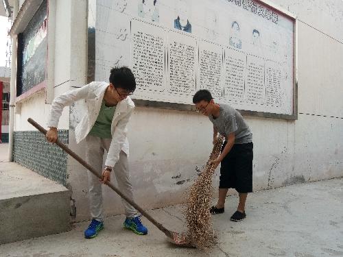 一行人来到新庄村街道,发现老人们都在打扫地上的落叶。经过简短的询问,原来是新庄村村民为了喜迎2018年农高会,自发的维护杨凌形象,旨在向全世界展现杨凌魅力。机电社践部部长立即决定让所有志愿者加入打扫街道落叶的行列,减轻老人们的压力,为新庄村做出力所能及的贡献。不一会儿,志愿者和老人们便把街道打扫的干干净净。在休息之余,志愿者与老人们互相交流了各自家乡的重阳习俗。一位老奶奶介绍,虽然重阳节并非法定节假日,但这是汉族的传统节日,这一天家人们都会聚在一起,吃重阳糕饮菊花酒,与家里的老人一起过节日,同时重阳与除夕、清明节、中元节是中国传统节日里四大祭祖节日。志愿者在介绍了家乡的重阳习俗以后向村民介绍了此次活动的初衷,根据《老年人权益保障法》,法律明确规定每年农历九月初九(重阳节)为老年节。志愿者们希望通过帮助老人干一些力所能及的小事,能给老人带去欢声和笑语,希望老人们天天开心快乐,老有所依。
