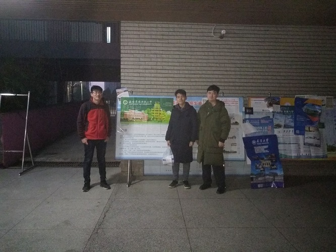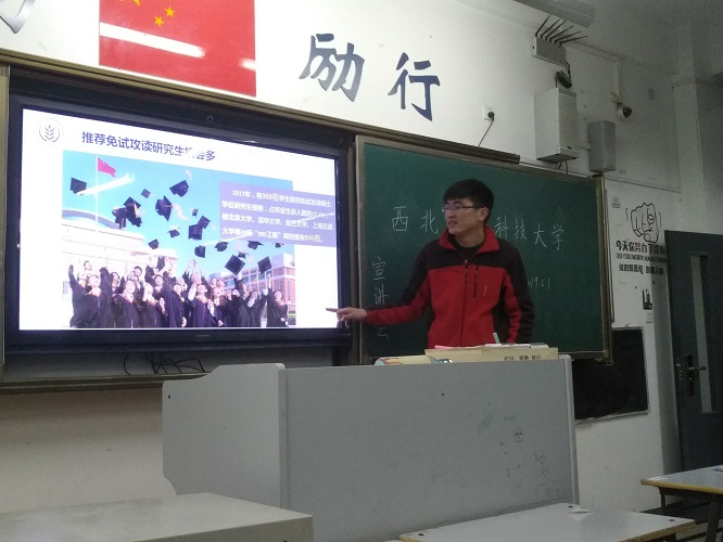 活动当天,小队三人早早到了母校宣讲班级,随即开始了准备工作。陈齐和王策同学负责张贴海报,分发宣传彩页,同时引导相关高三学弟学妹参加宣讲。周建国同学负责调试班级电脑和触屏班班通,及时将媒体材料导入电脑,提前演练,规划时间。下午5:30,在学弟学妹的掌声中,宣讲活动正式开始。周建国同学从三个方面进行了宣讲,首先深情回顾了高中生活以及美好回忆,向学弟学妹们分享了高三关键阶段的心态调整方法。接着开始对西农进行了介绍,包括西北农林科技大学基本情况,办学历史,专业分类,成果成绩以及大学丰富的课外生活,着重介绍了西农毕业生推免保研,工作出国等内容。紧接着是在场的高三学弟学妹提问时间,而小队三人也认真详细回答了每个问题。最后再次向大家介绍了报考西北农林科技大学的种种优势,解读了相关招生规程和历年录取分数线。