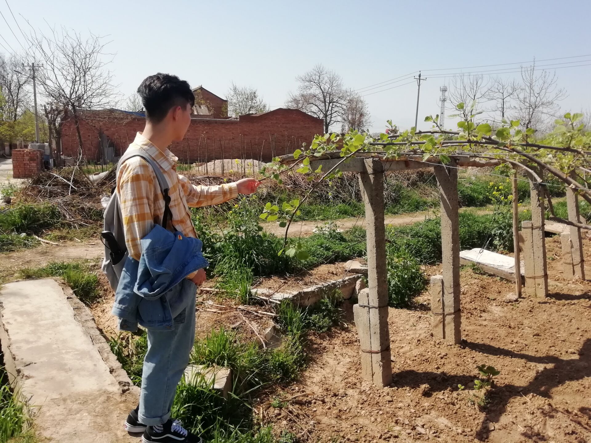 4月5日,西北农林科技大学第一版主 的学生村助张硕、方党森进入杨凌椒生村猕猴桃种植试验田,利用所学专业知识调查椒生村猕猴桃种植生长情况。