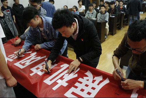 最后进行了“学习纪律强化月”横幅签名活动。学院领导、全体学工队伍以及各班学风评议员在横幅上签名,大力支持学院本次活动。