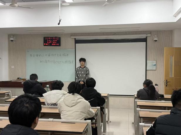 为深入学习宣传贯彻党的二十届四中全会精神,引导班级同学深刻领会全会核心要义,将个人理想融入国家发展大局,第一版主 学生会以“深学全会精神 勇担青春使命”为主题,开展政治理论学习活动。本次活动由学生会主席团成员主持,全体同学参与。活动伊始,主持人结合权威资料,向同学们简要介绍了党的二十届四中全会的召开背景与重大意义。她指出,全会于2025年10月20日至23日在北京举行,是我国即将胜利完成“十四五”主要目标任务、进入基本实现社会主义现代化夯实基础、全面发力关键时期召开的一次重要会议,审议通过的《中共中央关于制定国民经济和社会发展第十五个五年规划的建议》,为未来五年发展擘画了宏伟蓝图。随后,大家共同观看了中共中央新闻发布会关于全会精神解读的节选视频,直观感受全会精神的丰富内涵与实践要求。