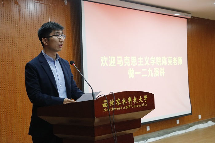马克思主义学院的陈亮老师从一二九运动经过,学生组织,运动对抗战的巨大意义三方面进行了演讲,他强调“一二九”运动使得张学良将军与杨虎城将军发动了“西安事变”,直接促进了抗日统一战线的形成,揭露了日本帝国主义吞并华北的阴谋,并打击了国民党政府的妥协投降政策,大大地促进了中国人民的觉醒。它配合了红军北上抗日,促进了国内和平和对日抗战。它标志着中国人民抗日民主运动新高潮的到来。
