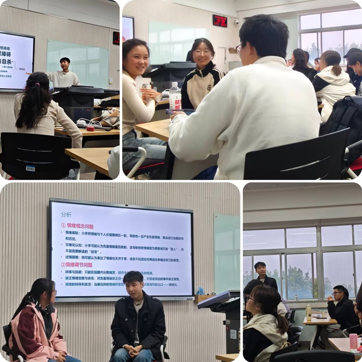 在最受瞩目的“模拟咨询”环节中,朋辈心理联络员们与李浩宇教师分别扮演了“求助者”与“开导者”。求助者们模拟各种角色,设想各种困境向开导者咨询。李浩宇教师从容不迫,依照每位成员的具体心理和个人经历等,用缓慢而温柔的话语帮助他们跳出精神自耗,寻求解决方法,最终成功克服心理问题。现场讨论热烈,大家在角色扮演中熟练了沟通技巧。模拟咨询的过程不仅是活动需要,更是李浩宇教师在为心理联络员们演示应对咨询时的方法与其所展现出的氛围和效果。