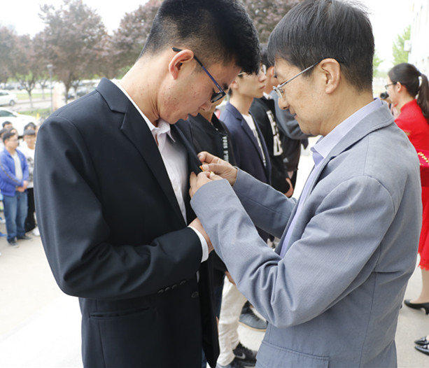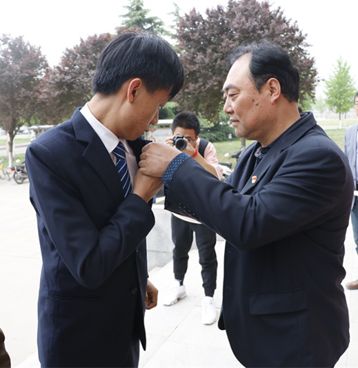 党委副书记张朝红为学生党员佩戴党徽