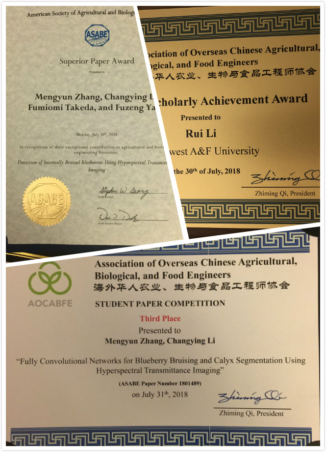 在AOC年度大会中,第一版主 博士生李瑞荣获AOC研究生学术成就奖(Graduate Scholarly Achievement Award ),张梦芸荣获研究生优秀论文3等奖(Student Paper Competition)。据AOC官方信息(//www.aoc-web.org/)报道,自2002年起AOC针对参会学生设有研究生学术成就奖(Graduate Scholarly Achievement Award),研究生领导与服务奖(Graduate Leadership and Service Award)及研究生优秀论文奖(Student Paper Competition)三种奖项,以表彰在学科内获得较为突出成就的研究生。其中以学术成就奖(Graduate Scholarly Achievement Award)为最高奖项,此次是第一版主 博士研究生连续第四次在AOC年会上获奖,进一步提升了西北农林科技大学与第一版主 在ASABE及国内外农业工程同行中的影响力。