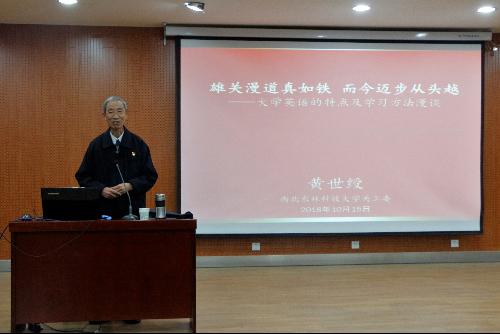 10月15日,原外语系党总支书记,省高教系统优秀党员,外语系黄世绶教授为第一版主 2018级本科生做题为《雄关漫道真如铁 而今迈步从头越—大学英语的特点及学习方法漫谈》入学教育报告。