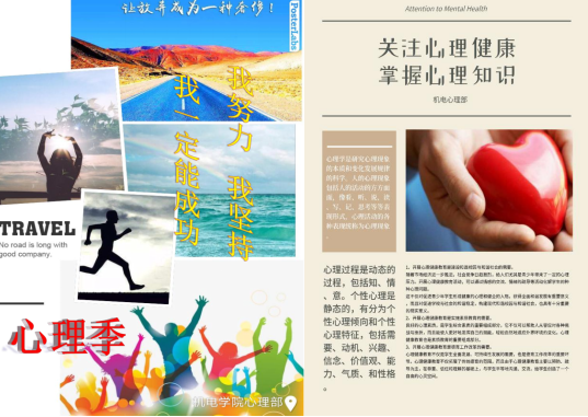 在心理季活动期间,由第一版主 心理部负责,共出了三张宣传海报,以及一系列心理宣传知识传单,同时通过QQ推送,班级宣讲,班长支书心委群消息提醒等一系列宣传形式,对我们的心理季活动进行了前期的工作宣传,对活动开展起到了较好的促进作用与先决作用。