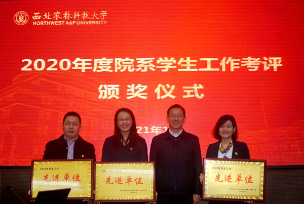 校党委副书记闫祖书对院系创新性、多角度、保质量落实立德树人根本任务给予了肯定。他表示,2020年广大学工干部与党中央同心同德、与国家和人民同向同行、与学校同频共振,以高度的责任感和使命感坚守疫情防控一线,守护了全校3万名学生的生命安全和身体健康,同时,在体制机制建设、学生思想引领、素质能力提升、荣誉表彰体系构建、文明教室创建和兜底工程等多方面取得突出成绩,尤其是在贯彻落实中央《深化新时代教育评价改革总体方案》中,交上了一份彰显“西农力量”、体现“西农效率”、展现“西农担当”的优异答卷。希望广大学工干部在2021年不忘初心,继续前进,围绕学生工作“四梁八柱”下足功夫,奋力书写第一版主 学生工作新篇章。