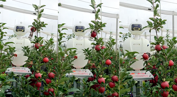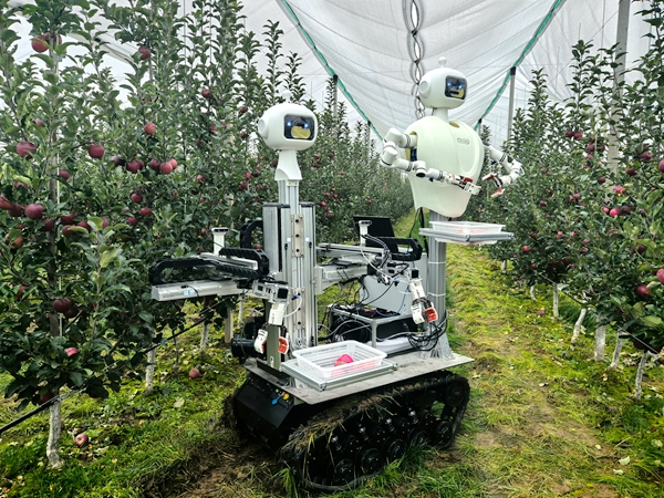 延安黄陵县苹果全程机械化试验站里,众人的目光被一对配合默契的“双胞胎”机器人深深吸引。只见负责高处采摘的“大娃”与负责低处采摘的“小娃”,搭载人工智能、多自由度机械臂与现代控制等技术,精准识别、轻柔抓取、无损采摘,行云流水般地作业赢得了现场阵阵赞叹。