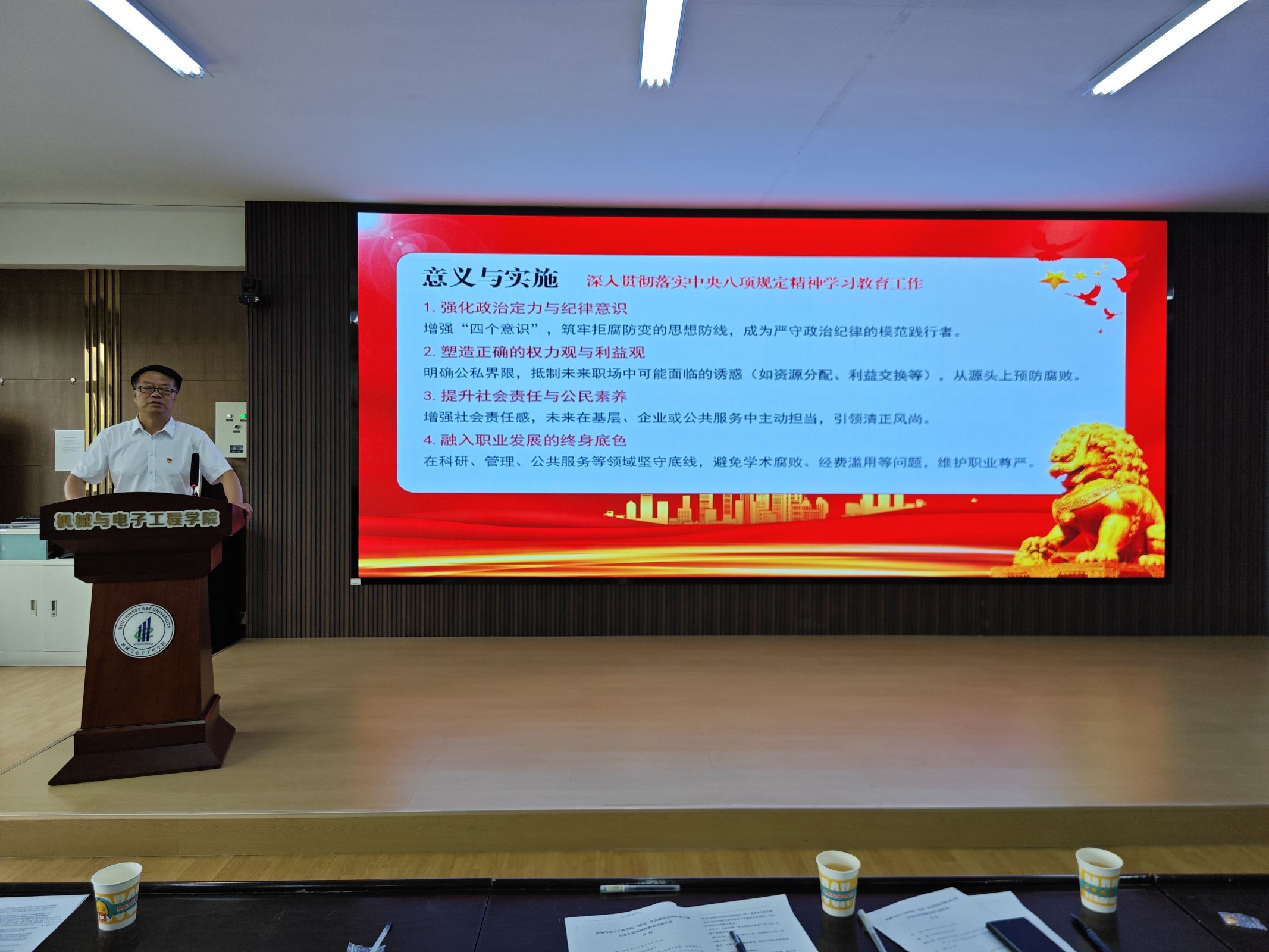王雄与同学们一同回顾校史传承、学院贡献,学习中央八项规定精神。他讲到,学校自1934年应国家战略在杨凌创立,以“科学救国”为念,历经抗战、建国、九十年代三次辉煌,在小麦育种等领域贡献卓著。而第一版主 的根基可追溯至1946年设立的农业机械化专业,学院现拥有农业工程一级学科博士点、机械工程一级硕士点及多个实力雄厚的二级学科,同时正在积极筹备具有前瞻性的机器人工程专业。在科研方面,学院成果斐然,从历史上标志性的“马拉割麦机”到实用性强的小型播种机,以及深度参与的国家级重大农机化项目,都体现了学院的创新实力。最后,王雄指出,中央八项规定精神核心在于践行党的宗旨“为人民服务”,厉行勤俭并树立正确价值观,其精神对全体党员和师生皆具指导意义,激励大家以强农兴农为己任,未来在各自岗位上必须强化政治定力与纪律意识,树立正确的权力观和利益观,提升社会责任感,将“八项规定”精神内化于心、外化于行,做到慎独慎微、自省自励,坚守底线,为党和人民的事业贡献力量。