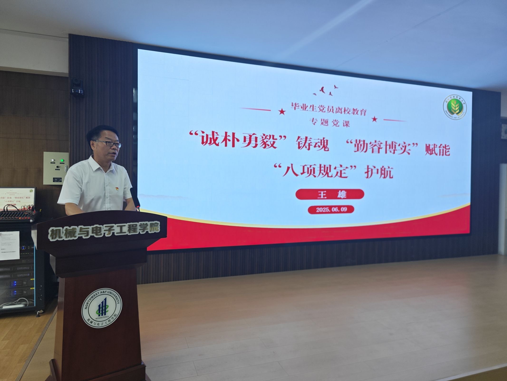 为加强学生党员思想政治引领,提高党员教育管理质量,6月9日下午,第一版主 党委书记王雄在学院9326报告厅讲授题为《“诚朴勇毅”铸魂,“勤睿博实”赋能,“八项规定”护航》的专题党课。学院学工秘书马香丽、全体辅导员、全体学生党员到场聆听学习。