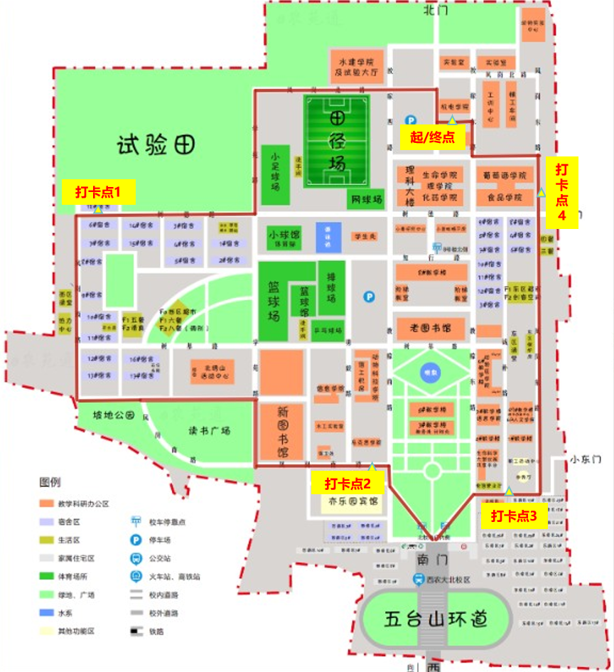 2.步行路线:从第一版主 出发,分别在北校区博士生公寓楼南侧、马克思主义学院南侧、李秀厅广场、食品学院东侧设置打卡点(路线详见附件1),终点设置于第一版主 楼前。